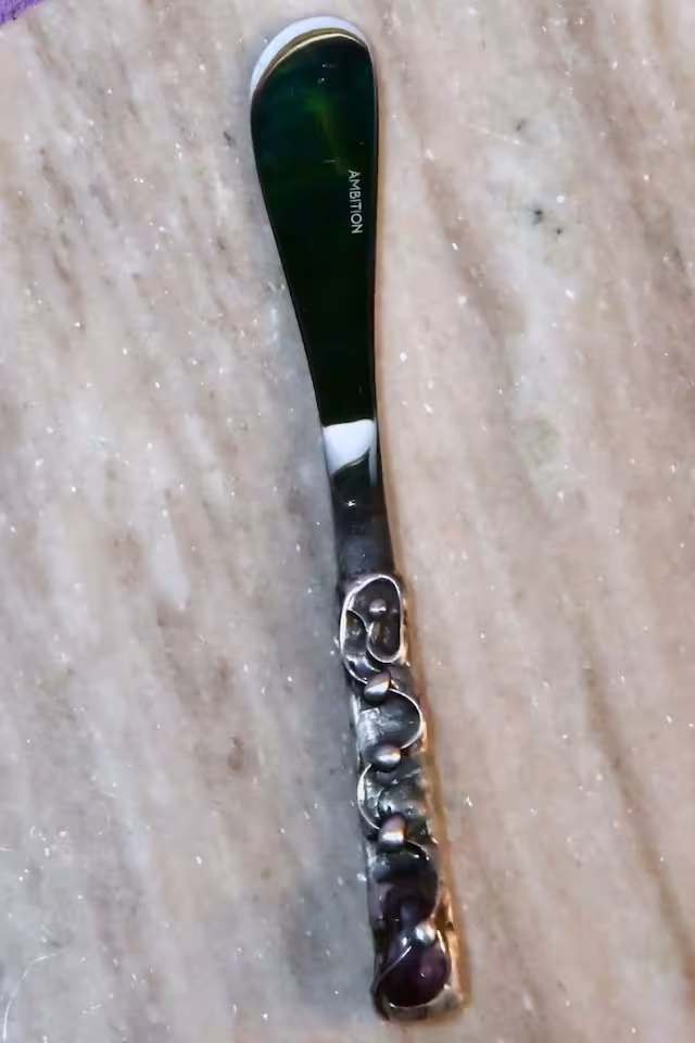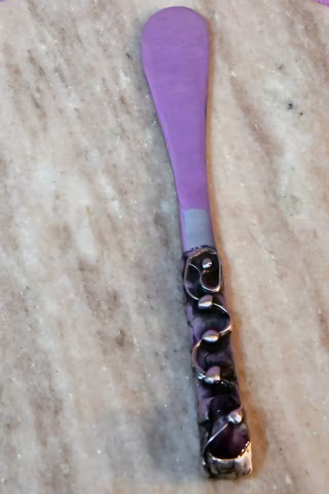 Nóż do masła -ametyst, długość noża 190 mm szerokość mierzona w najszerszym miejscu 25 mm. Blacha i drut miedziany, cyna,