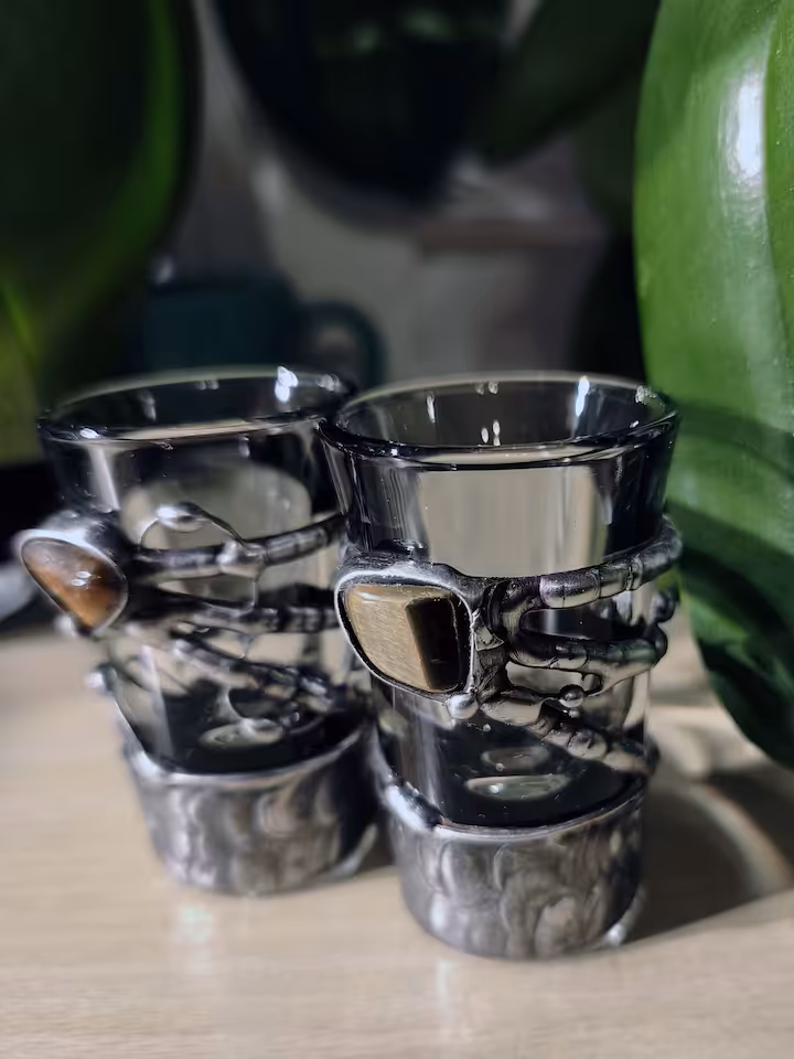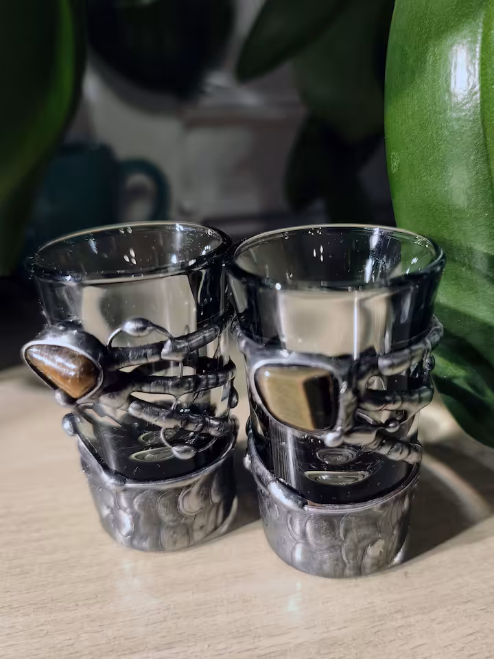 Kieliszki do nalewek (wódki) z Tygrysie oko, pojemność 25 ml. blacha i drut miedziane, cyna.