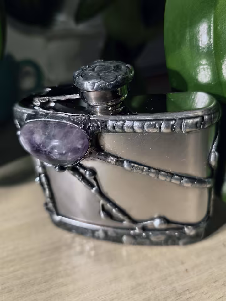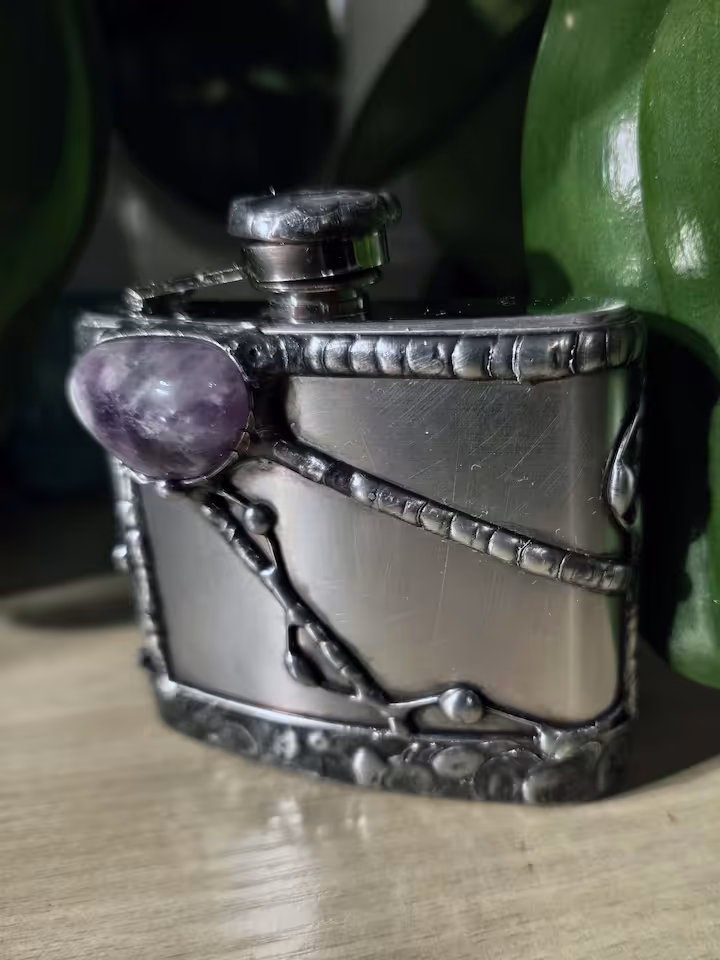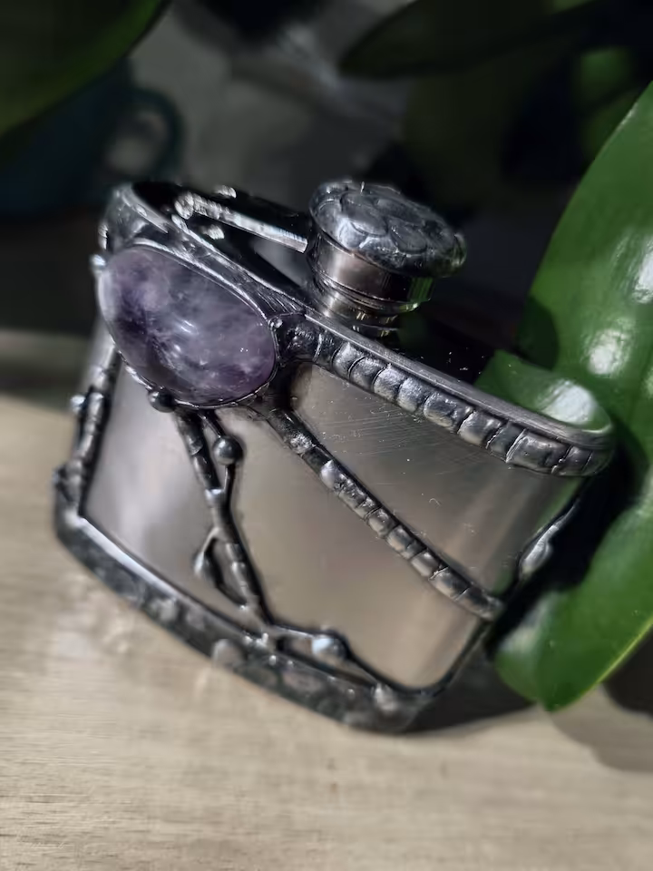 Piersiówka do nalewek (wódki) 180 ml. Kamień Ametyst, piersiówka wysokość 115 mm, podstawa 95 x 25 mm, drut i blacha miedziana, cyna.