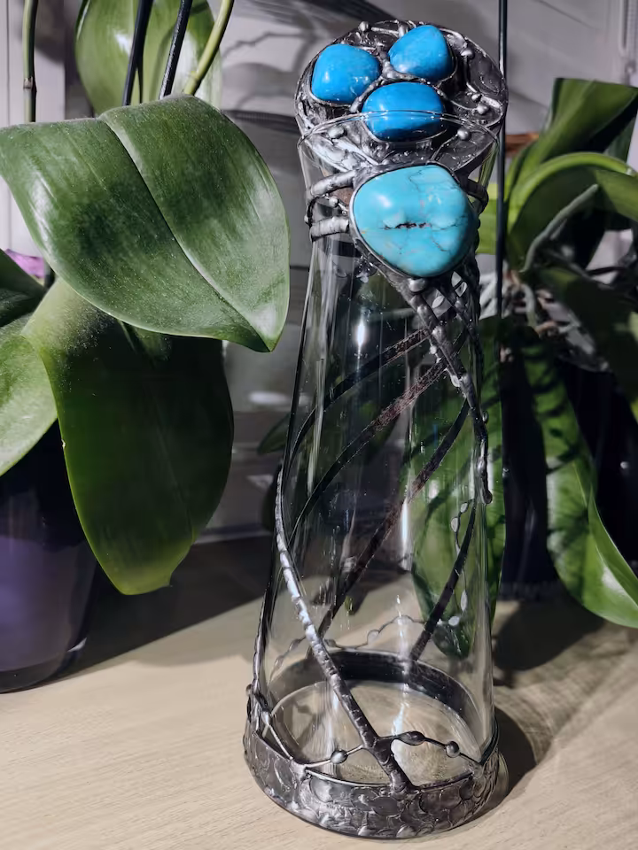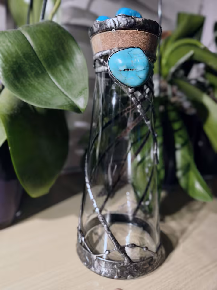 Karafka na wino (napoje), z Turkmenitem, pojemność 1000 ml, korek kamień Howlit 3 szt. wysokość 250 mm, średnica dół 100 mm.