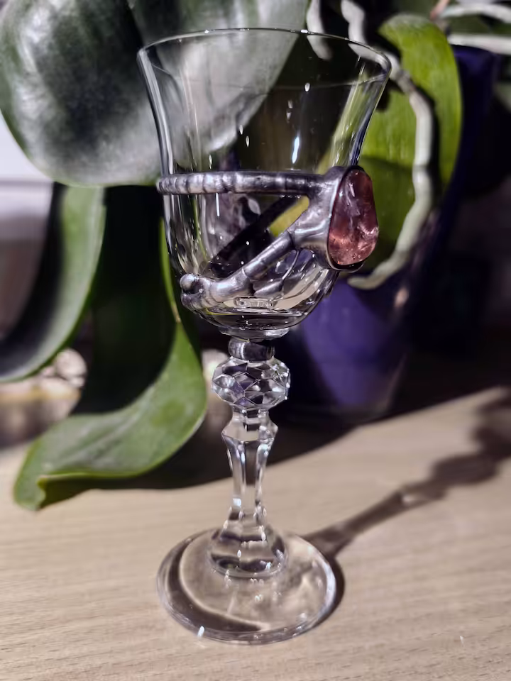 Kieliszki do nalewek (wódki) pojemność 50 ml. Kamień Ametyst, wysokość 135 mm, średnica góry 55 mm, średnica dół 50 mm, blacha i drut miedziane, cyna.