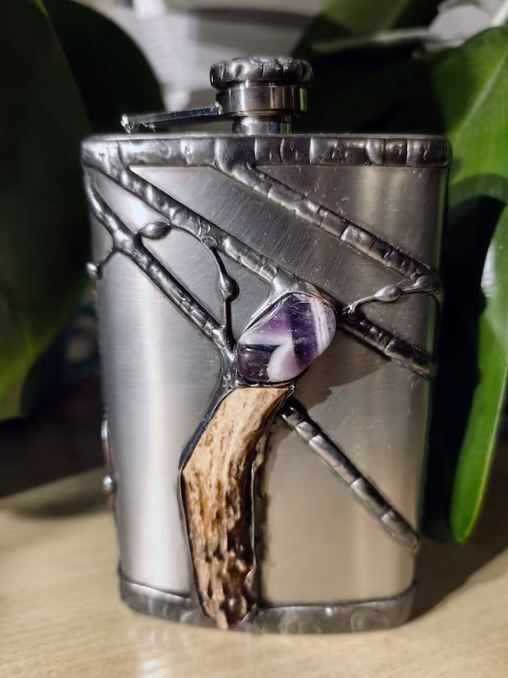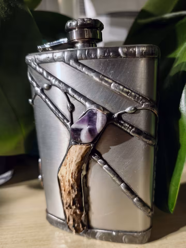 Piersiówka do nalewek (wódki) 300 ml. Róg (parostek, koziołka sarny) i Ametyst, piersiówka wysokość 145 mm, podstawa 95 x 25 mm, drut i blacha miedziana, cyna.