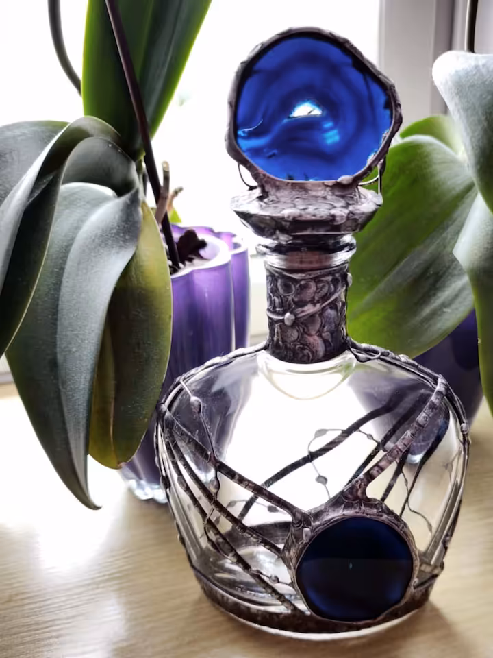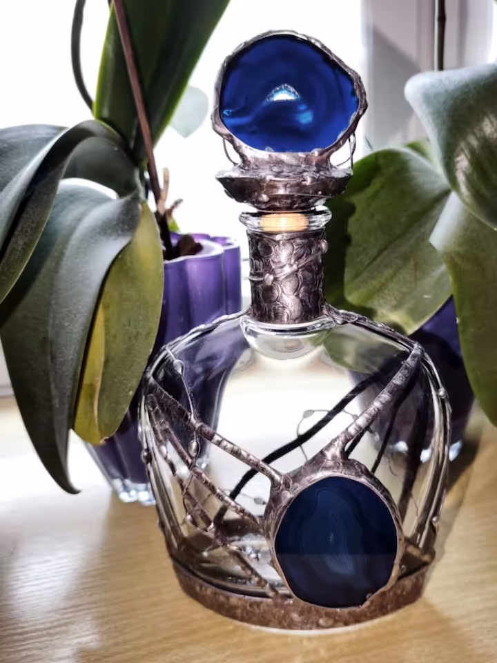 Karafka do nalewek (wódki) 700 ml. Kamień Agat, korek Agat, karafka wysokość 240 mm, podstawa 130 mm x 60 mm, drut i blacha miedziana, cyna.
