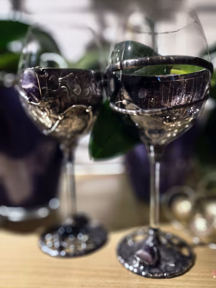 Kieliszek do wina czerwonego kamień Ametyst 2 szt. Pojemność 350 ml, wysokość 210 mm. Blacha i drut miedziane, cyna.