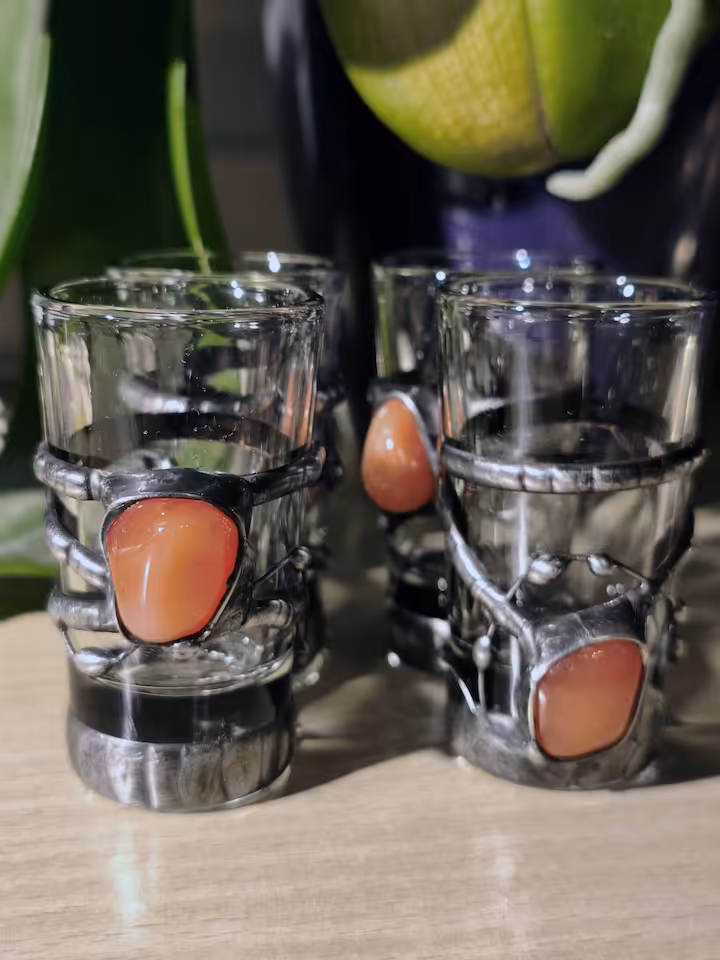 Kieliszki do nalewek (wódki) z karneolem, pojemność 30 ml. blacha i drut miedziane, cyna.