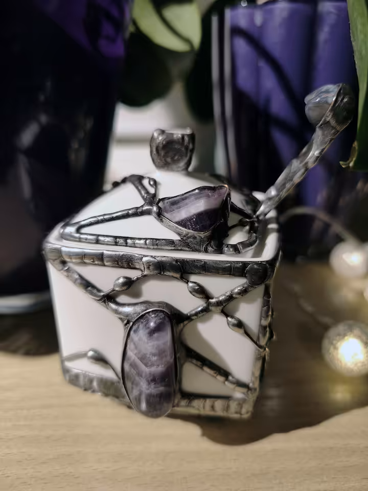 Cukierniczka - kamień Ametyst, wymiary cukiernicy pojemność 0,26 l, wysokość 102 mm. Drut i blacha miedziana, cyna.
